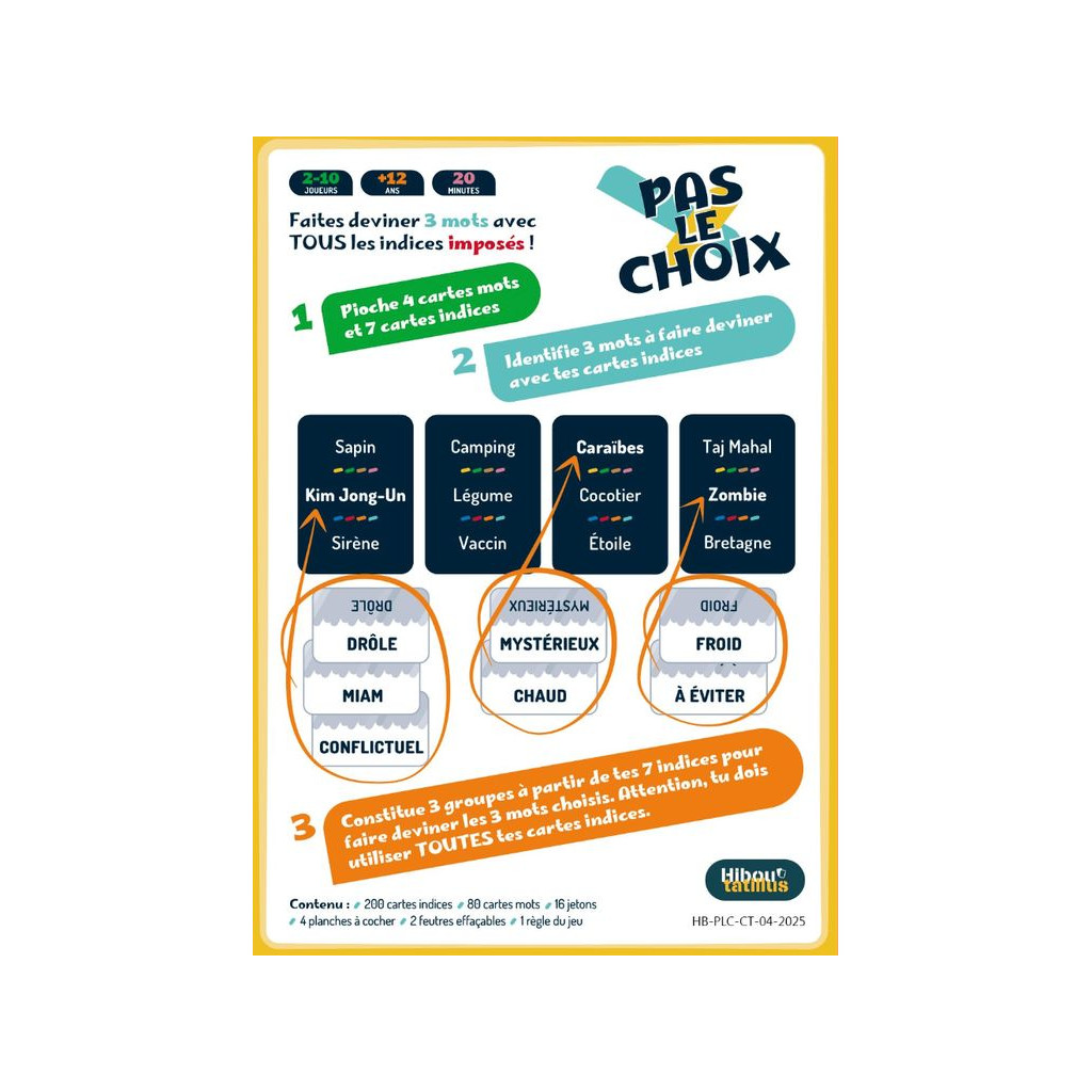 Pas le choix ! est un jeu d’ambiance et de déduction où vous devez faire deviner 3 mots… en utilisant obligatoirement 7 indices imposés, même ceux qui compliquent tout.