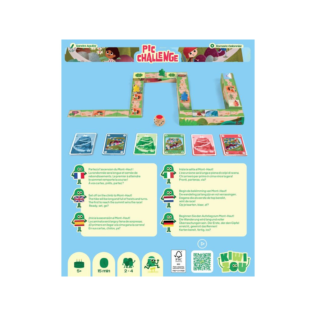 Pic Challenge est un jeu de parcours familial : partez à l’ascension du Mont-Haut et soyez le premier à atteindre le sommet, en avançant grâce à des cartes plutôt qu’avec un simple lancer de dé.