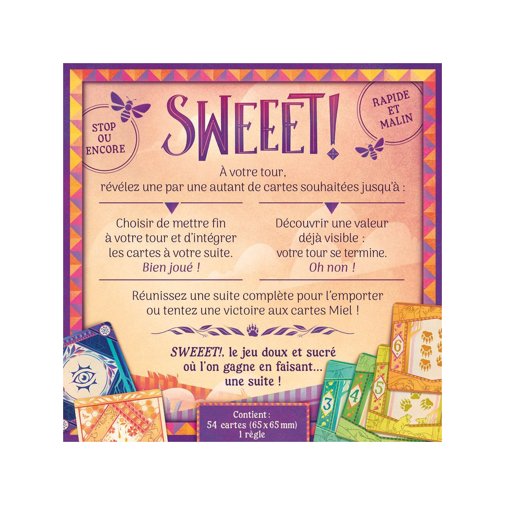 SWEEET! est un jeu de stop-ou-encore où vous prenez des risques pour être le premier à réunir une suite complète de 8 cartes, ou tenter une victoire instantanée en révélant les 4 cartes Miel lors d’un même tour.